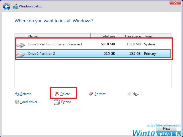 6.选择和删除系统分区 - 通常为:驱动器0分区1和驱动器0分区2。