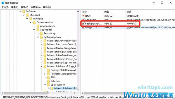 打开注册表的路径:HKEY_CURRENT_USER\SOFTWARE\Classes\Local Settings\Software\Microsoft\Windows\CurrentVersion\AppModel\SystemAppData\Microsoft.MicrosoftEdge_8wekyb3d8bbwe\SplashScreen\Microsoft.MicrosoftEdge_8wekyb3d8bbwe!MicrosoftEdge,找到「BackgroundColor」注册表,双击打开。