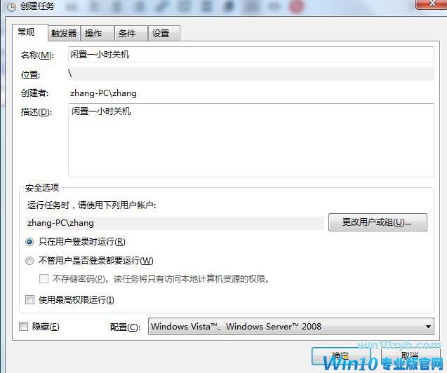 点条件选项卡,勾起仅当计算机空闲时间超过下列值时才启动此任务,并输入时间,(实际关机时间=输入的时间+15分钟,win7 15分后才开始计算空闲时间),等待空闲时间为不等待,空闲状态继续勾上,其它选项看自己情况选,点确定