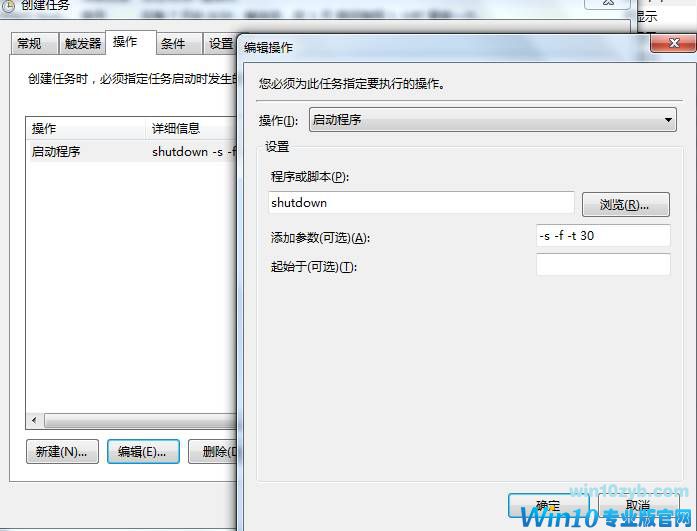 点操作选项卡,点新建.在打开的新建操作窗口中,点操作后的下拉菜单,选启动程序,程序或脚本下面输入关机命令:shutdown ,在添加参数(可选)后输入合适参数如