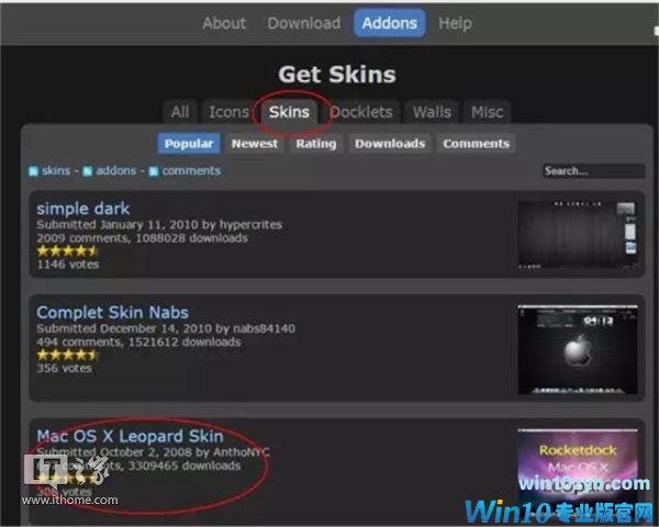 进入官网的素材下载界面,我们在skins目录下看到“Mac OS X Leopard Skin”,这就是我们需要的皮肤,不过你刚才在网盘下载的资料包里已经有了,所以不用再次下载了。
