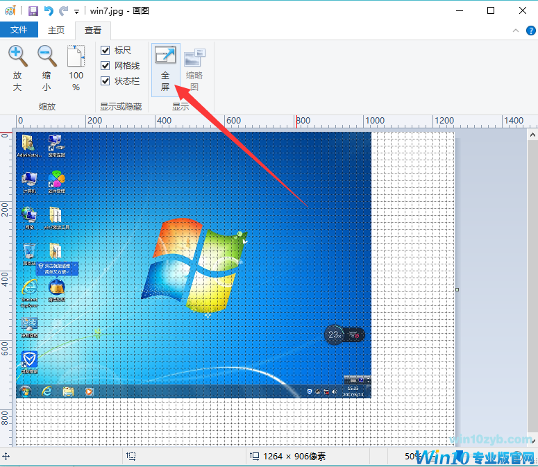 Win10画图还提供了“全屏”功能,可以在整个屏幕上以全屏方式查看图片。操作方法:在画图“查看”选项卡的“显示”中,单击“全屏”,即可全屏查看图片,再次单击鼠标左键即可退出,或者按ESC键退出全屏返回“画图”窗口。