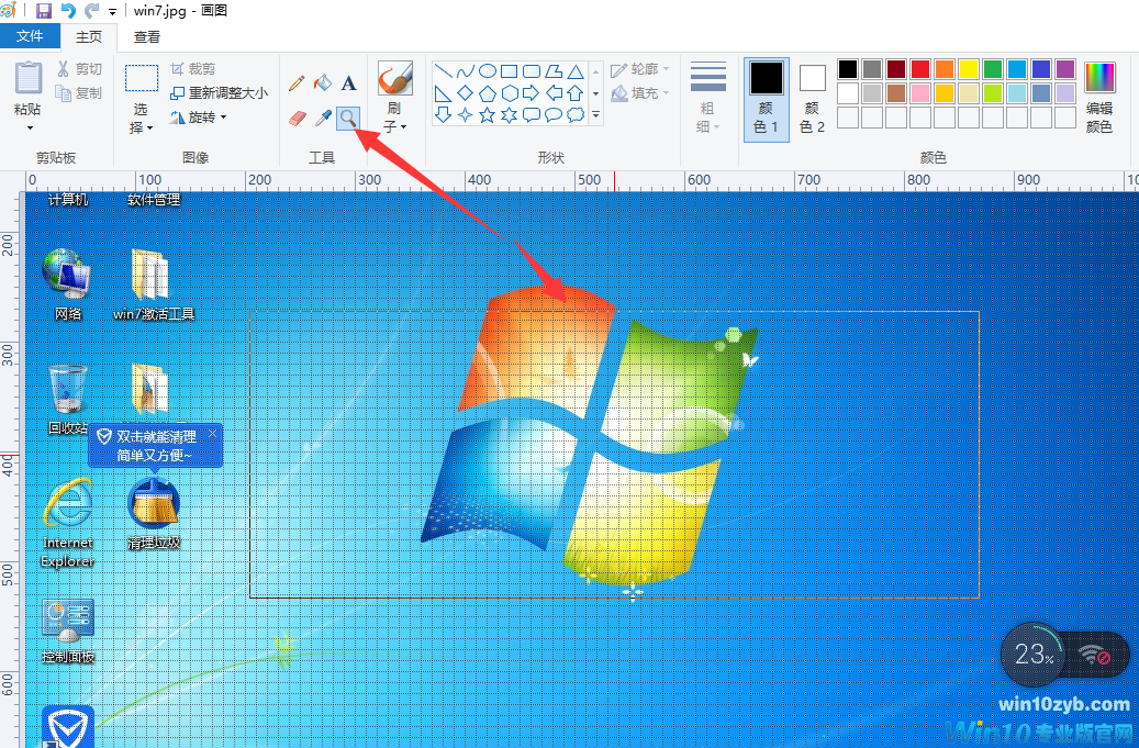 有时因为图片局部文字或者图像太小而看不清楚,这时,就可以利用画图中的“放大镜”工具,放大图片的某一部分,方便查看。操作时,鼠标左键单击放大,鼠标右键单击缩小。放大镜模式可以通过侧边栏移动图片的位置。
