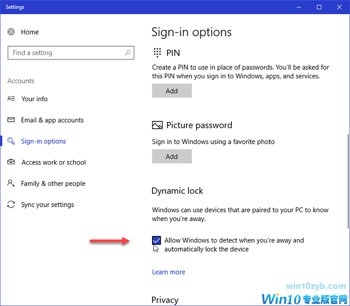 要启用动态锁定功能,只需选中允许Windows当您离开并自动锁定设备时检测复选框。