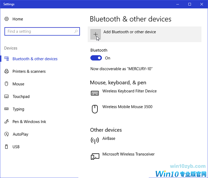 确保蓝牙开关设置为开,然后单击添加蓝牙或其他设备按钮。