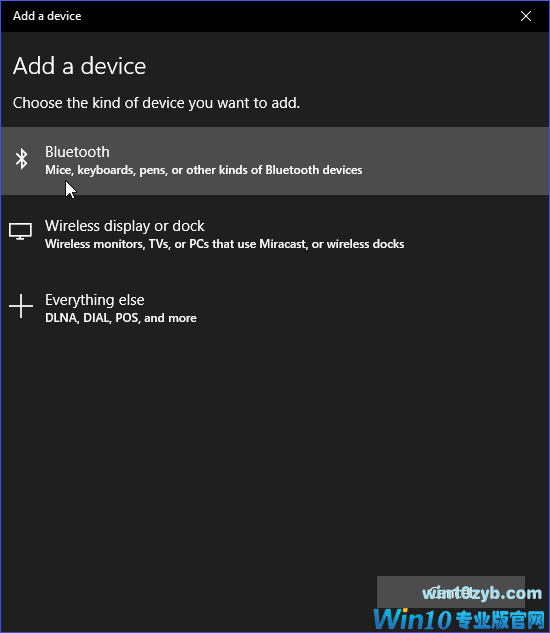 您将从“添加设备”对话框中选择“蓝牙”选项。