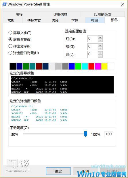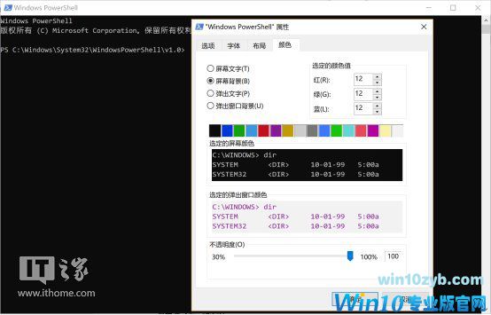 在从Win+X菜单启动的Powershell和CMD标题栏上右击,选择“属性”,弹出窗口的颜色选项卡依然是旧版配色,但“默认值”窗口弹出的却是新版配色,不知为什么。还请评论区的各位不吝赐教。