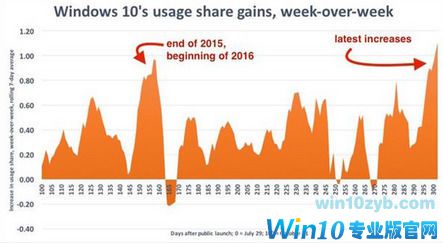 来自StatCounter的数据显示,近两周Windows 10升级出现了一个小高峰,这是继去年8月份之后,Windows 10升级数量最高的一段时间。