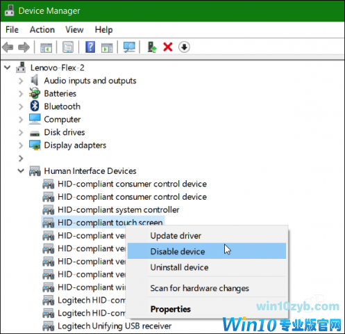 在设备管理器中,左键单击人机界面设备以展开下拉菜单。 然后右键单击符合HID的触摸屏,然后选择禁用驱动程序。 再次右键单击它并选择启用。