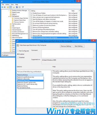此策略设置允许您在“我的电脑”中隐藏这些指定的驱动器。此策略设置允许您从“我的电脑”和“文件资源管理器”中删除表示所选硬盘的图标。此外,表示所选驱动器的驱动器号不会出现在标准打开对话框中。如果启用此策略设置,请在下拉列表中选择驱动器或驱动器组合。此策略设置将删除驱动器图标。用户仍然可以通过使用其他方法访问驱动器内容,如通过在“运行”对话框中或在“命令”窗口中键入驱动器上的目录路径到“映射网络驱动器”对话框中。此外,此策略设置不会阻止用户使用程序访问这些驱动器或其内容。而且,它不会阻止用户使用“磁盘管理”管理单元查看和更改驱动器特性。如果禁用或不配置此策略设置,则会显示所有驱动器,或者在下拉列表中选择“不要限制驱动器”选项。