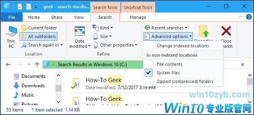 请注意,当在非索引位置进行搜索时,Windows将仅搜索文件名而不是其内容。 要更改此选项,请单击“高级选项”按钮,然后打开“文件内容”选项。 Windows将进行更深入的搜索并找到文件中的单词,但可能需要更长时间。