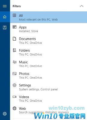 默认情况下,每当用户通过“开始”菜单搜索内容时,该工具将搜索索引文件,Bing,OneDrive,Windows Store和其他在线位置的所有内容。 用户可以通过点击“过滤器”按钮并选择“文档”,“文件夹”,“照片”或“视频”来缩小搜索范围。