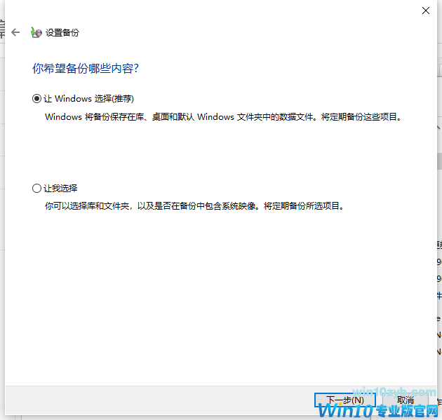 5.出现提示,选择备份内容。这里有【让Windows选择】和【让我选择】。根据个人情况选择一种,单击【下一步】