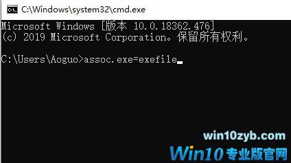 2.在命令提示符界面输入“assoc.exe=exefile”命令并按回车键即可恢复exe文件的关联。