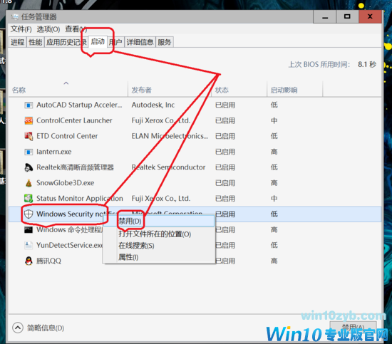 2.任务管理器页面,点击【启动】,找到【Windows secruity notice】,右键点击【禁用】
