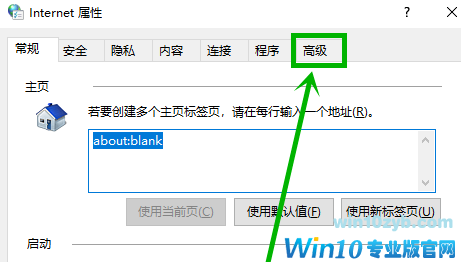5、在打开的【Internet属性】窗口,点击【高级】选项卡