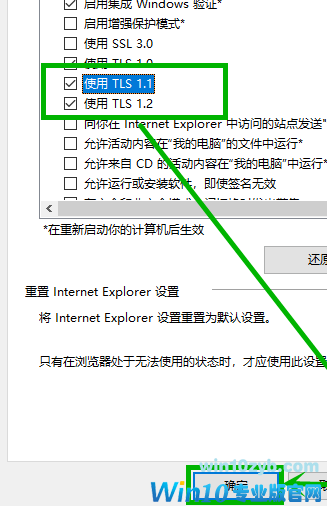 6、在打开的【高级】选项卡,下拉选择【使用TLS1.1】和【使用TLS1.2】两项,然后点击【应用】后【确定】就行了