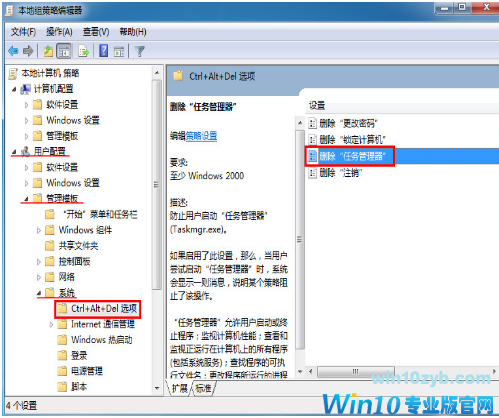 2、在弹出的本地组策略编辑器中,依次点开用户配置→管理模板→系统→ctrl+alt+del选项然后再双击右框中的删除“任务管理器”。