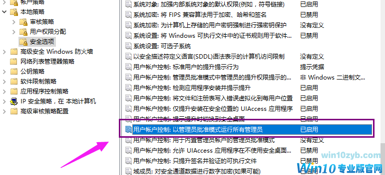 3、找到“用户账户控制:以管理员批准模式运行所有管理员”策略,右键点击属性。