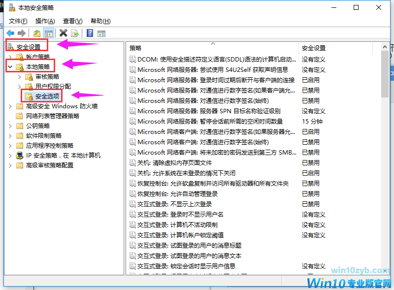 2、在打开的本地安全策略窗口中,依次打开安全设置→本地策略→安全选项。