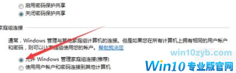4、把右侧进度条用鼠标拉到最下面,有一个管理家庭组连接。在允许前面鼠标点击选择。