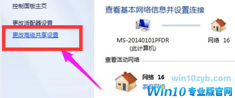 2、点击左上角‘更改高级共享设置’。进入到共享设置页面。