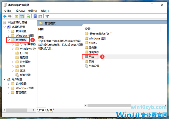 4、然后再在编辑器左侧点击“管理模板”,右侧点击“网络”。