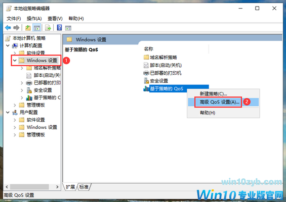 2、先点击左侧的“Windows设置”,再右键点击右侧的“基于策略的QoS”选择“高级QoS设置”。
