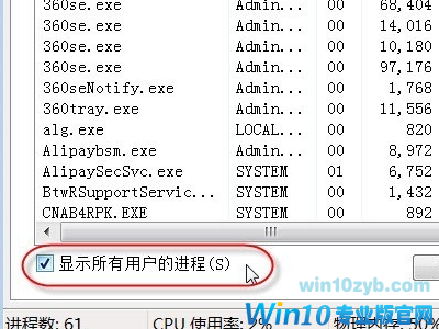 5、切换到“进程”选项卡,要想看到已登录的用户正在运行的进程以及系统帐户下运行的进程,可单击“显示所有用户的进程”按钮。这样就会显示所有进程了。
