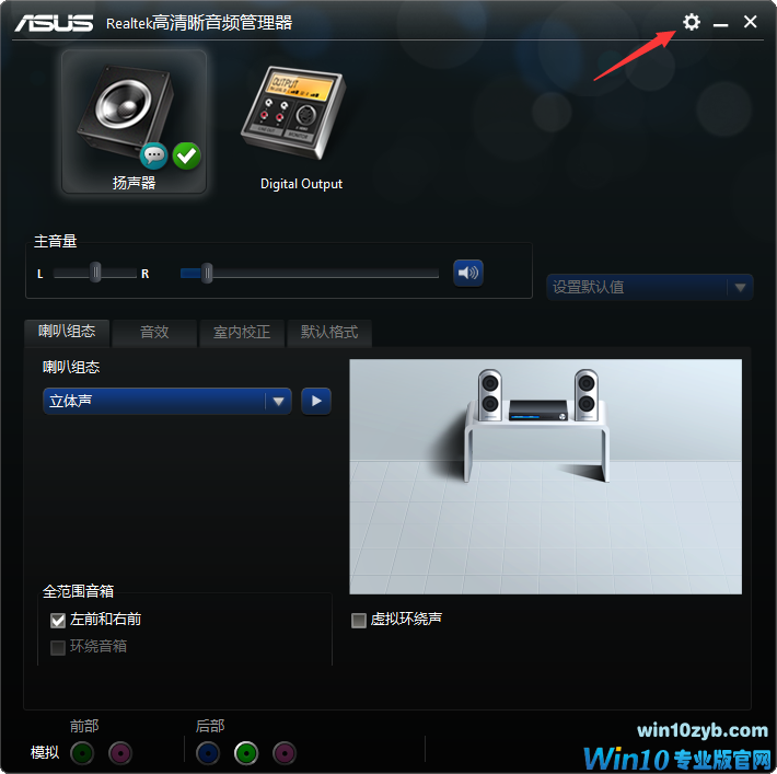 双击打开Realtek高清晰音频管理器,出现以下界面,点击右上角的设置。