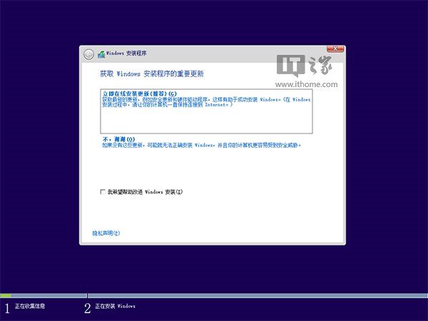 ▲这里可随意选择,如果时间紧迫可以选择完成Win10安装之后再更新。点击“下一步”继续