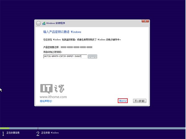 ▲此处可用安装密钥VK7JG-NPHTM-C97JM-9MPGT-3V66T(只用于专业版安装,激活无效),输入后点击“下一步”继续;也可以点击“跳过”,在安装完成后输入激活密钥