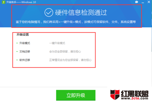 检测也完成,这里就会告诉你硬件是否支持升级,如果都通过,点击下方的“立即升级”