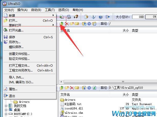 把我们的U盘插到电脑的USB接口,然后点击UltraISO软碟通-文件-打开。选择刚才下载的“U盘启动盘制作工具”Win10zyb_Upan.iso,具体位置就看你刚才下载的时候保存到哪里的。