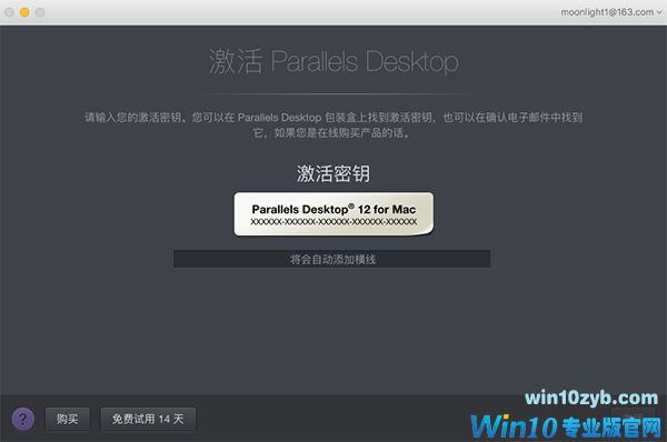 8.如果你已经购买了Parallels Desktop12激活码,那么输入激活码激活即可;如果没有激活码想要试用的话,就点击左下角的“免费试用14天”。