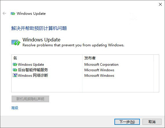 拿Windows10版为例,工具只有100多KB,下载方便,无需安装,运行流畅。打开后可以看到,该工具主要解决三个方面问题:Windows更新、后台智能传输服务和Windows网络诊断。点击“下一步”即可开始进行。