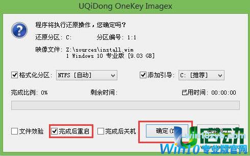 3、程序提醒执行还原操作,勾选复选框“完成后重启”,然后点击确定,如图: