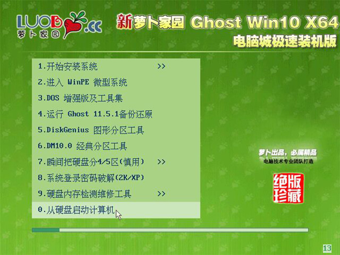 安装请设置光盘启动,然后选择"DOS工具箱",进入带帮助信息的命令提示符状态,此时输入GHOST即可执行手动安装