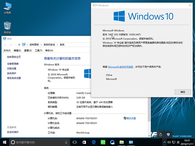 1、源安装盘采用微软官方2016年11月09日最新发布的稳定版Windows10(x32) - DVD (Chinese-Simplified) 专业版操作系统,更新补丁(KB3200970),原版支持在线升级,补丁已经更新为最新。