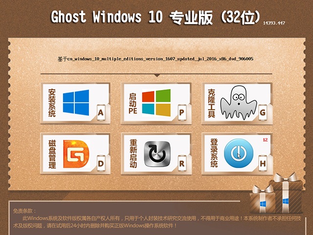 1、源安装盘采用微软官方2016年11月09日最新发布的稳定版Windows10(x32) - DVD (Chinese-Simplified) 专业版操作系统,更新补丁(KB3200970),原版支持在线升级,补丁已经更新为最新。