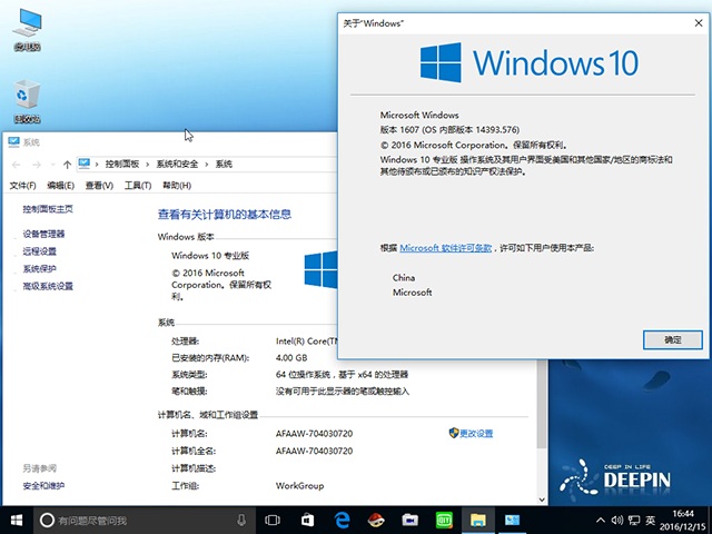 深度技术Ghost Windows10 X64装机专业版(14393.576)