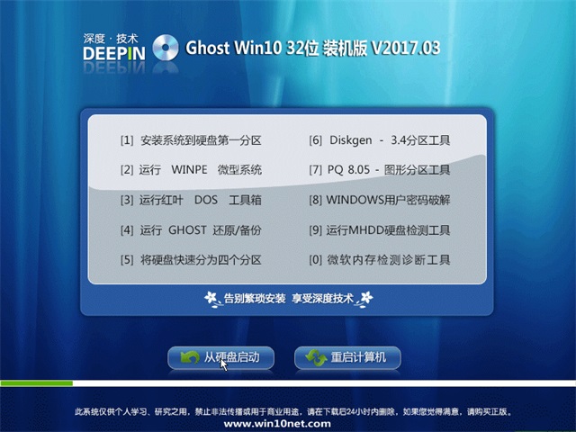深度技术Win10x32位装机版系统仅用于进行演示基于万能GHOST的快速部署技术,除了系统和光盘中明确标识为原创 作品的软件外,其他的全部文件归属于原版权人所有。我们不承担任何技术和版权问题,没有提供任何技术支持的义务.请勿将本系统用于商业用途!