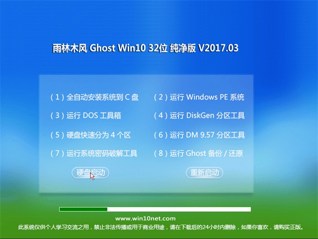 雨林木风Win10x32位纯净版系统仅用于进行演示基于万能GHOST的快速部署技术,除了系统和光盘中明确标识为原创 作品的软件外,其他的全部文件归属于原版权人所有。我们不承担任何技术和版权问题,没有提供任何技术支持的义务.请勿将本系统用于商业用途。