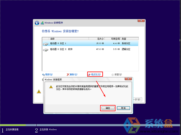 4、接下来选择你要安装的分区,如果不需要备份之前的系统,那么点击格式化,确定后进入安装环节;