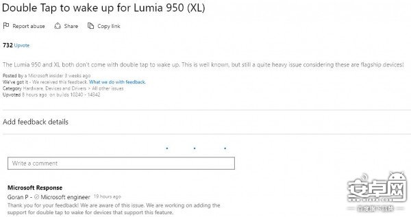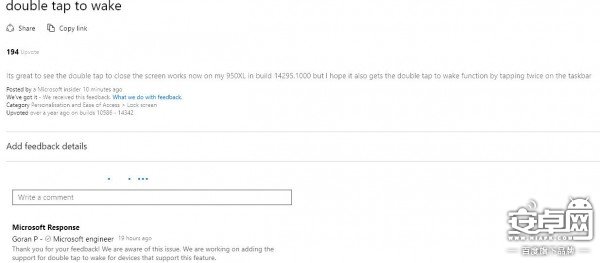 除此之外,Aul并未披露更多的信息。倒是微软工程师Goran P在Feedback Hub中就用户的需求给了回应,表示他们正在为支持“双击唤醒”的设备添加这项功能。