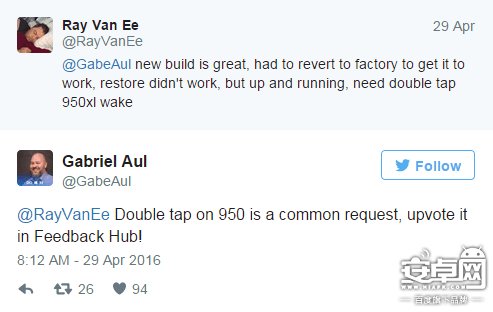 上个月月底,Windows Insiders项目负责人Gabriel Aul在回复网友的推文中指出,如果用户想要在Windows 10 Mobile设备中用上“双击唤醒”,那么请到Feedback Hub(反馈中心)投上赞成票。