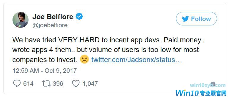 周一,微软副总裁Joe Belfiore在一系列推文中表示,微软将不再为Windows 10 Mobile(其旗舰操作系统的智能手机版)开发新的硬件或功能,逐步让Win10 Mobile退出手机市场。微软将继续为其提供发布BUG修复和安全更新,但不会生产搭载Win 10的移动硬件。Belfiore表示,微软试图“非常努力”激励APP开发人员,甚至为此付出高昂代价,但承不得不承认Windows 10 Mobile上的用户数量太少,无法达到预期目标。