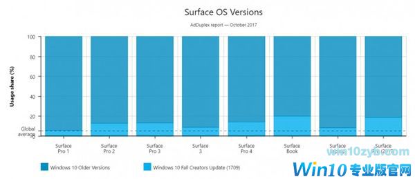 此外从数据显示,升级至最新Windows 10秋季创作者更新的Surface设备中最多的是Surface Book,其次是新款Surface Pro。