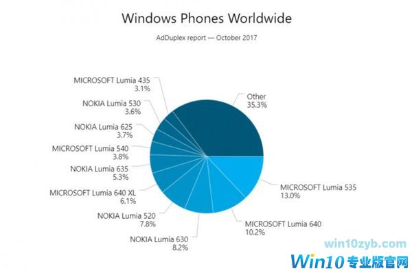 而在手机方面基本上和上个月没有太大的改变。从全球来看,Lumia 535依然是使用做频繁的Windows手机,尽管该机并不符合Windows 10 Mobile秋季创作者更新的升级标准。第二款是Lumia 640,同样无法获得最新版本升级。