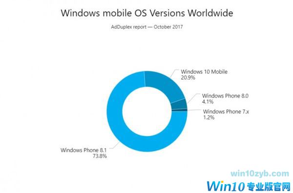 Windows手机系统的版本占比也没有发生改变,WP 8.1依然是使用最多的设备,而WP 7和8一起占比刚刚超过5%。Windows 10 Mobile只有20.9%。